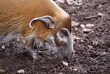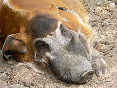 The red river hog (Potamochoerus porcus), is a wild member of the pig family living in Africa, with most of its distribution in the Guinean and Congolian forests. It is rarely seen away from rainforests, and generally prefers areas near rivers or swamps.[2]