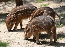 The mother constructs a nest from dead leaves and dry grass before giving birth to a litter of up to six piglets, with three to four being most common.[3] The piglets weigh 650 to 900 g (23 to 32 oz) at birth, and are initially dark brown with yellowish stripes and spots. They are weaned after about four months, and develop the plain reddish adult coat by about six months; the dark facial markings do not appear until they reach adulthood at about two years of age. They probably live for about fifteen years in the wild.[3]