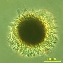 The growth and persistence of an algal bloom depends on wind direction and strength, temperature, nutrients, and salinity.[1] Red tide species can be found in oceans, bays, and estuaries, but they cannot thrive in freshwater environments.[2][1] Certain species of phytoplankton and dinoflagellates like Gonyaulax found in red tides contain photosynthetic pigments that vary in color from brown to red. These organisms undergo such rapid multiplication that they make the sea appear red. When the algae are present in high concentrations, the water may appear to be discolored or murky. The most conspicuous effects of red tides are the associated wildlife mortalities and harmful human exposure. The production of natural toxins such as brevetoxins and ichthyotoxins are harmful to marine life.[3] Effects of red tides can worsen locally due to wind driven Langmuir circulation and their biological effects.