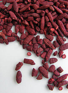 Red yeast rice (simplified Chinese: 红曲米; traditional Chinese: 紅麴米; pinyin: hóng qū mǐ; lit. 'red yeast rice'), red rice koji (べにこうじ, lit. 'red koji'), red fermented rice, red kojic rice, red koji rice, anka, or angkak, is a bright reddish purple fermented rice, which acquires its color from being cultivated with the mold Monascus purpureus. Red yeast rice is what is referred to as a "koji" in Japanese, meaning "grain or bean overgrown with a mold culture", a food preparation tradition going back to ca. 300 BC.[1] In both the scientific and popular literature in English that draws principally on Japanese traditional use, red yeast rice is most often referred to as "red rice koji." English language articles favoring Chinese literature sources prefer the translation "red yeast rice."