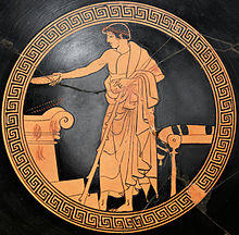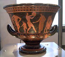Although from a modern perspective the vase painters are often considered as artists, and their vases thus as works of art, this view is not consistent with that held in antiquity. Vase painters, like potters, were considered as craftsmen, their produce as trade goods.[10] The craftsmen must have had a reasonably high level of education, as a variety of inscriptions occur. On the one hand, the aforementioned Kalos inscriptions are common, on the other hand, inscriptions often label the depicted figures. That not every vase painter could write is shown by some examples of meaningless rows of random letters. The vases indicate a steady improvement of literacy from the 6th century BC onwards.[11] Whether potters, and perhaps vase painters, belonged to the Attic elite has not been satisfactorily clarified so far. Do the frequent depictions of the symposium, a definite upper-class activity, reflect the painters' personal experience, their aspirations to attend such events, or simply the demands of the market?[12] A large proportion of the painted vases produced, such as psykter, krater, kalpis, stamnos, as well as kylikes and kantharoi, were made and bought to be used at symposia.[13]