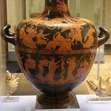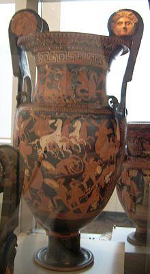The artists using the ornate style tended to favour large vessels, like volute kraters, amphorae, loutrophoroi and hydriai. The larger surface area was used to depict up to 20 figures, often in several registers on the body of the vase. Additional colours, especially shades of red, yellow-gold and white are used copiously. Since the 2nd half of the 4th century, the necks and sides of the vases are decorated with rich vegetal or ornamental decorations. At the same time, perspective views, especially of buildings such as "Palace of Hades" (naiskoi), develop. Since 360 BC, such structures are often depicted in scenes connected with burial rites (naiskos vases). Important representatives of this style are the Ilioupersis Painter, the Darius Painter and the Baltimore Painter. Mythological scenes were especially popular: The assembly of the Gods, the amazonomachy, the Trojan War, Heracles and Bellerophon. Additionally, such vases frequently depict scenes from myths that are only rarely illustrated on vases. Some specimens represent the single source for the iconography of a particular myth. Another subject that is unknown from Attic vase painting are the theatre scenes. Especially farce scenes, e.g. from the so-called phlyax vases are quite common. Scenes of athletic activity or everyday life only occur in the early phase, they disappear entirely after 370 BC.[20]