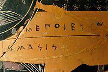 The Kerameikos was the potters' quarter of Athens. It contained a variety of small workshops, and probably a few larger ones. In 1852, during building activity in Ermou Street, the workshop of the Jena Painter was discovered. The artefacts from it are now on display in the University collection of the Friedrich Schiller University of Jena.[7] According to modern research, the workshops were owned by the potters. The names of about 40 Attic vase painters are known, from vase inscriptions, usually accompanied by the words ἐγραψεν (égrapsen, has painted). In contrast, the signature of the potter, ἐποίησεν (epoíesen, has made) has survived on more than twice as many, namely about 100, pots (both numbers refer to the totality of Attic figural vase painting). Although signatures had been known since c. 580 BC (first known signature by the potter Sophilos), their use increased to an apex around the Pioneering Phase. A changing, apparently increasingly negative, attitude to artisans led to a reduction of signatures, starting during the Classical period at the latest.[8] Overall, signatures are quite rare. The fact that they are mostly found on especially good pieces indicates that they expressed the pride of potter and/or painter.[9]