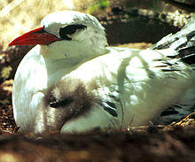 The red-tailed tropicbird is thought to be monogamous,[31] pairs remaining bonded over successive breeding seasons, although such information as age at first breeding and pair-formation is not known.[36] It nests in loose colonies,[37] on offshore islands and stacks, rocky cliffs, coral atolls and cays. It rarely nests on large bodies of land, though has done so in southern Western Australia.[19] The nest itself is a shallow scrape, in either shaded sand[38] or a rocky crevice,[37] or under a shrub. Because the red-tailed tropicbird does not walk well, it lands by flying into the wind, stalling and dropping to the ground. The nest is often located within one metre (3.3 ft) of the edge of the shrub (or other shaded area) to minimise walking distance. The tropicbird often chooses shrubs with fewer stems for accessibility.[39]