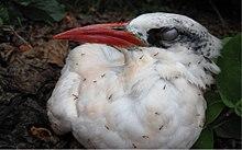 Born helpless and unable to move around (nidicolous and semi-altricial), the chicks are initially blind, opening their eyes after 2–3 days. Until they are a week old, they open their beak only upon touch, so the parents have to stroke the base of the bill to initiate feeding. Feeding takes place once or twice a day, generally around midday. They are constantly brooded by the parents until they are a week old, after which time they are sheltered under the parents’ wings. They also rise up and gape at any nearby bird for food.[21] Both parents feed the young,[36] by shoving its beak into the chick's gullet and then regurgitating food.[42] Initially covered with grey or white down, they grow their first feathers—scapulars—at 16–20 days. Their feet and beaks grow rapidly, outpacing the rest of their bodies.[21] Chicks remain in the nest for 67 to 91 days until they fledge.[37]