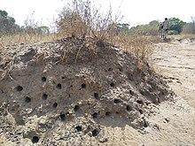 The red-throated bee-eater is a colonial species, nesting in groups and remaining in the nesting area all year round. The nests are tunnels, excavated before the ground dries after the rainy season, the colony having up to about fifty nests. The diet of these birds consists mostly of honey-bees and stingless bees, as well as other insects. When foraging, a pair or a few individuals move around together, and can sometimes be seen perched in a row side by side.[2][3]