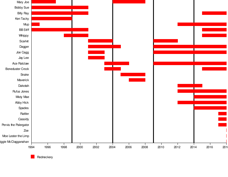 - 2018: Zoe, Jiggie McClagganahan, Moe Lester the Limp join. Whippy, Abby Hick, Boneduster Crock, Joe Cagg, Rattler leave. Billy Ray, BB Stiff become reserves.[1]