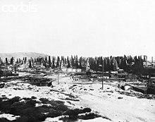At the turn of the 20th century, Imperial Russia's output of oil, almost entirely from the Apsheron Peninsula, accounted for half of the world's production and dominated international markets.[9] Nearly 200 small refineries operated in the suburbs of Baku by 1884.[10] As a side effect of these early developments, the Apsheron Peninsula emerged as the world's "oldest legacy of oil pollution and environmental negligence".[11] In 1846, Baku (Bibi-Heybat settlement) became the first ever well drilled with percussion tools to a depth of 21 meters for oil exploration. In 1878, Ludvig Nobel and his Branobel company "revolutionized oil transport" by commissioning the first oil tanker and launching it on the Caspian Sea.[9]