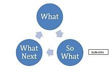 Terry Borton's 1970 book Reach, Touch, and Teach popularized a simple learning cycle inspired by Gestalt therapy composed of three questions which ask the practitioner: What, So what, and Now what?[13] Through this analysis, a description of a situation is given which then leads into the scrutiny of the situation and the construction of knowledge that has been learnt through the experience. Subsequently, practitioners reflect on ways in which they can personally improve and the consequences of their response to the experience. Borton's model was later adapted by practitioners outside the field of education, such as the field of nursing and the helping professions.[14]