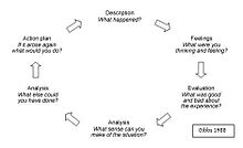 Gibbs' suggestions are often cited as "Gibbs' reflective cycle" or "Gibbs' model of reflection", and simplified into the following six distinct stages to assist in structuring reflection on learning experiences:[20]