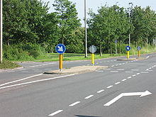 A refuge island, also known as a pedestrian refuge or pedestrian island, is a small section of pavement or sidewalk, completely surrounded by asphalt or other road materials, where pedestrians can stop before finishing crossing a road. It is typically used when a street is very wide, as the pedestrian crossing can be too long for some individuals to cross in one traffic light cycle. They may also be seen on roads with higher speed limits. In the United Kingdom, refuge islands are commonly illuminated by a white 300 mm beacon mounted on a 5 m grey pole with white reflective bands.[1] In 2015, a solar powered version of the refuge Beacon was introduced, requiring no mains cabling and incorporating the energy saving technology cited in patent GB2519445.[2]