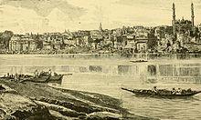 On 15 June 1824 Heber set out on a tour of northern India, accompanied by his personal chaplain, Martin Stowe, and Daniel Corrie, the Archdeacon of Calcutta.[60] Amelia remained in Calcutta; earlier in the year she had given birth to her third daughter, Harriet.[61] The general plan was to travel by boat to the upper waters of the River Ganges, then overland into the foothills of the Himalayas before turning south and west, crossing Rajputana to reach Bombay.[4] The journey was almost aborted near to its beginning when Stowe fell ill in Dacca (present-day Dhaka, Bangladesh) and died there; after some hesitation, Heber decided that the tour should continue.[62] Early in August the party reached Benares (now Varanasi), the largest of the cities in the Ganges plain, where Heber spent several weeks. It was a wholly Indian city without a European population, sacred to Hindus, Sikhs and Buddhists but with a well-established CMS school and a substantial Christian minority. Heber consecrated a new church, and when he conducted a Holy Communion service in both English and Hindustani, a large congregation of Christians and Hindus thronged the church.[63][64]