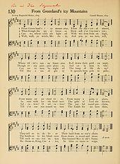 One whose popularity has waned is the missionary hymn "From Greenland's Icy Mountains", written in 1819 as part of a country-wide campaign on behalf of the Society for the Propagation of the Gospel (SPG). Watson describes this as "a conspicuous example of that fervent belief to convert the world to Christianity which led Heber and others to lay down their lives in the mission field",[48] and while widely sung until the second half of the 20th century, it was for instance omitted from the 1982 revision of the Episcopal Church hymnal.[49] Betjeman felt that in the modern world, the words of this hymn seem patronising and insensitive to other beliefs, with references to "...every prospect pleases and only man is vile", and to "the heathen in his blindness [bowing] down to wood and stone".[47] These phrases and the assumptions behind them offended Gandhi, who drew attention to them in a speech at YMCA Calcutta (Kolkata) in 1925: "My own experience in my travels throughout India has been to the contrary ... [Man] is not vile. He is as much a seeker after truth as you and I are, possibly more so".[50] Other Heber texts remain popular, and the Dictionary of North American Hymnology noted that most of his hymns remain in use.[51]