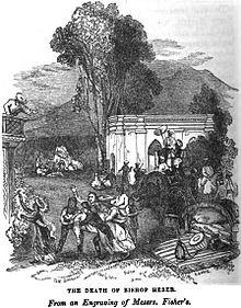 In spite of the pressures on his time, Heber set out again on 30 January 1826, this time heading south for Madras, Pondicherry, Tanjore, and ultimately Travancore. One reason for the tour was to examine the issue of caste, which persisted in Southern India.[4] In Tanjore on Easter Day, 26 March 1826, Heber preached to more than 1300, and on the following day conducted a confirmation service for a large Tamil congregation. On 1 April he moved on to Trichinopoly where, next day, he confirmed 42 people. On 3 April, after attending an early-morning service at which he gave a blessing in the Tamil language, Heber returned to his bungalow for a cold bath. Immediately after plunging into the water he died, possibly from the shock of the cold water in the intense heat.[73] Watson records that a contemporary engraving shows his body "being carried from the bath by his servant and chaplain, the latter immaculately attired in a frock coat and top hat".[74] His funeral was held the next day at St John's church, where he had preached his final sermon; he was buried within the church, on the north side of the altar.[75]