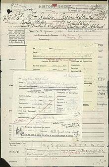 Judson enlisted in the New Zealand Expeditionary Force (NZEF) in October 1915 and embarked for the Middle East in January 1916 as a reinforcement with the New Zealand Rifle Brigade.[2] In February, shortly after arriving in Egypt where the New Zealand Division was in the process of being formed, he was transferred to 1st Battalion, Auckland Infantry Regiment. Two months later, the division was transferred to the Western Front. Promoted to corporal,[3] he participated in the Battle of Flers-Courcelette on 15 September 1916, where he was seriously wounded. He was evacuated to England and spent several months recovering from his injuries. Once his health permitted, he performed training duties and then spent a period of time in charge of a Royal Engineers depot in Codford.[2]