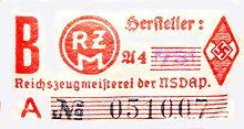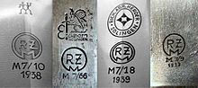 All pieces of equipment had to be labelled with a visible RZM copyright protection symbol and a product-assigned RZM number that contained encoded data about the textile sector, material group, producer number and year of production. All products were at first tested by World War I veterans and invalids, but after the outbreak of World War II prisoners of war were used. Some equipment parts were also stored and shipped from the RZM in Munich.[1][2]