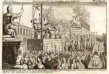 Many long-held rights and powers were stripped from the church and given to the state. In 1789, church lands were expropriated and priests killed or forced to leave France.[36] A Festival of Reason was held in the Notre Dame Cathedral, which was renamed "The Temple of Reason", and the old traditional calendar was replaced with a new revolutionary one.[37] The leaders of the Terror tried to address the call for these radical, revolutionary aspirations, while at the same time trying to maintain tight control on the de-Christianization movement that was threatening to the clear majority of the still devoted Catholic population of France. The tension sparked by these conflicting objectives laid a foundation for the "justified" use of terror to achieve revolutionary ideals and rid France of the religiosity that revolutionaries believed was standing in the way.