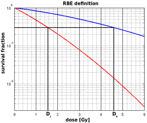 where DX is a reference absorbed dose of radiation of a standard type X, and DR is the absorbed dose of radiation of type R that causes the same amount of biological damage. Both doses are quantified by the amount of energy absorbed in the cells.