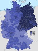 Demographics of religion in Germany vary greatly by region and age. Non-religious people represent the majority in some of Germany's major cities, including Berlin and Hamburg, and the absolute majority of 70–80% in the eastern states of what between 1949 and 1990 used to be East Germany.[7] By contrast, rural areas of the western states of what in the same period used to be West Germany are more religious, and some rural areas are highly religious.[8]