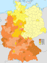 In 2016, the survey Politbarometer provided data regarding religion in each of the states of Germany for adults who are entitled to vote (18+), as reported in the table below.[72] Christianity is the dominant religion of Western Germany, excluding Hamburg, which has a non-religious plurality. Northern Germany has traditionally been dominated by Protestantism, especially Lutheranism. The two northernmost provinces of Schleswig-Holstein and Lower Saxony have the largest percentage of self-reported Lutherans in Germany.[73] Southern Germany has a Catholic majority, but also a significant Lutheran Protestant population (especially in Northern Württemberg and some parts of Baden and Franconia (Northern Bavaria)), in contrast to the almost entirely Protestant Northern Germany. Irreligion is predominant in Eastern Germany, which was the least religious region amongst 30 countries surveyed in a study in 2012.[74][75][76]