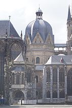 During the Carolingian period, Christianity spread throughout Germany, particularly during the reign of Charlemagne (r. 800–814 AD) and his expansionary military campaigns. Religious structures built during the Carolingian period include the Palatine Chapel, Aachen, a surviving component of the Palace of Aachen built by architect Odo of Metz during the reign of Charlemagne.[10]