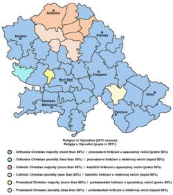 According to the 2011 census, the largest Protestant communities were recorded in the municipalities of Kovačica (11,349) and Bački Petrovac (8,516), as well as in Stara Pazova (4,940) and the Vojvodinian capital Novi Sad (8,499), which are predominately Orthodox.[1] While Protestants from Kovačica, Bački Petrovac and Stara Pazova are mostly Slovaks, members of Slovak Evangelical Church of the Augsburg Confession in Serbia, services in most of the Protestant churches in Novi Sad are performed in the Serbian language.[2]