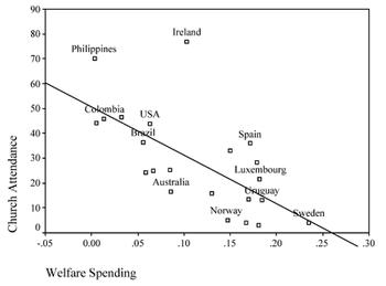 A market-based theory of religious choice and governmental regulation of religion have been the dominant theories used to explain variations of religiosity between societies. However, Gill and Lundsgaarde (2004) [15] documented a much stronger correlation between welfare state spending and religiosity. See "Welfare spending vs Church attendance" diagram on the right.