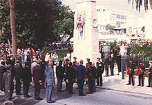 In Barbados, Remembrance Day is not a public holiday. It is recognised as 11 November, but the parade and ceremonial events are carried out on Remembrance Sunday.[13] The day is celebrated to recognise the Barbadian soldiers who died fighting in the First and Second World Wars. The parade is held at National Heroes' Square, where an interdenominational service is held.[14] The Governor-General and Barbadian Prime Minister are among those who attend, along with other government dignitaries and the heads of the police and military forces. During the main ceremony a gun salute, wreaths, and prayers are also performed at the war memorial Cenotaph at the heart of Heroes' Square in Bridgetown.[15]