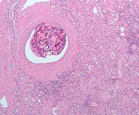 Recent studies have brought attention to the close association of the type of cancerous cells to the aggressiveness of the condition. Some studies suggest that these cancerous cells accumulate glycogen and lipids, their cytoplasm appear "clear", the nuclei remain in the middle of the cells, and the cellular membrane is evident.[59] Some cells may be smaller, with eosinophilic cytoplasm, resembling normal tubular cells. The stroma is reduced, but well vascularised. The tumour compresses the surrounding parenchyma, producing a pseudocapsule.[60]