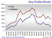 Thomas Engelhardt wrote in left-liberal journal The Nation that "Numbers in Iraq are a slippery matter at best, though again, why anyone pays serious attention to US military numbers from that country is a mystery. On countless occasions in the past, these have been ridiculous undercounts of disaster."[30] The Washington Post stated on September 25 that "Apparent contradictions are relatively easy to find in the flood of bar charts and trend lines the military produces. Civilian casualty numbers in the Pentagon's latest quarterly report on Iraq last week, for example, differ significantly from those presented by the top commander in Iraq, Gen. David H. Petraeus, in his recent congressional testimony." The story quoted a Multi-National Force-Iraq spokesperson saying that "There is a current effort to consolidate multiple databases in theater".[31]