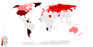 There is a significant relationship between the quality of maternal services made available and the greater financial standings of a country.[19] Sub-Saharan Africa and South Asia exemplify this as these regions are significantly deprived of medical staff and affordable health opportunities.[20] Most countries provide for their health services through a combination of funding from government tax revenue and local households.[19] Poorer nations or regions with extremely concentrated wealth can leave citizens on the margins uncared for or overlooked. However, the lack of proper leadership can result in a nation's public sectors being mishandled or poorly performing despite said nation's resources and standing.[19] In addition, poorer nations funding their medical services through taxes places a greater financial burden on the public and effectively the mothers themselves.[20] Responsibility and accountability on the part of mental health sectors are strongly emphasized as to what will remedy the poor quality of maternal health globally.[20] The impact of different maternal health interventions across the globe stagger variously and are vastly uneven.[19] This is the result of a lack of political and financial commitment to the issue as most safe motherhood programs internationally have to compete for significant funding.[20] Some resolve that if global survival initiatives were promoted and properly funded it would prove to be mutually beneficial for the international community. Investing in maternal health would ultimately advance several issues such as: gender inequality, poverty and general global health standards.[21] As it currently stands, pregnant women are subjugated to high financial costs throughout the duration of their term internationally that are highly taxing and strenuous.