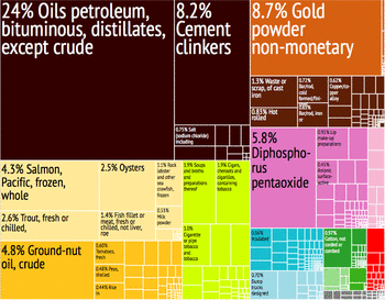 Senegal's economy is centered mostly on commodities and natural resources. Major industries are fish processing, phosphate mining, fertilizer production, petroleum refining, construction materials, and ship construction and repair. As in most African nations, agriculture is a major sector, with Senegal producing several important cash crops, including peanuts, sugarcane, cotton, green beans, tomatoes, melons, and mangoes.[11] Owing to its relative stability, tourism and hospitality are also burgeoning sectors.