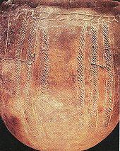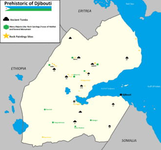 Pottery predating the mid-2nd millennium has been found at Asa Koma, an inland lake area on the Gobaad Plain. The site's ware is characterized by punctate and incision geometric designs, which bear a similarity to the Sabir culture phase 1 ceramics from Ma'layba in Southern Arabia.[18] Long-horned humpless cattle bones have likewise been discovered at Asa Koma, suggesting that domesticated cattle were present by around 3,500 years ago.[19] Rock art of what appear to be antelopes and a giraffe are also found at Dorra and Balho.[20] Handoga, dated to the fourth millennium BCE, has in turn yielded obsidian microliths and plain ceramics used by early nomadic pastoralists with domesticated cattle.[21]