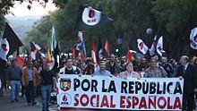 By its members' own admission, as well as by that of the bulk of the far-right public opinion,[2] the MSR was roughly inscribed in what is usually called the Third Position, and adheres to the commonplace strategy of defending socializing (and at times leftist) doctrines abroad, whereas adopting conservative and anti-immigration stances at a domestic level. Its slogan was 'Spain-Republic-Socialization'.