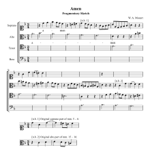 Süssmayr brings the choir to a reference of the Introit and ends on an Amen cadence. Discovery of a fragmentary Amen fugue in Mozart's hand has led to speculation that it may have been intended for the Requiem. Indeed, many modern completions (such as Levin's) complete Mozart's fragment. Some sections of this movement are quoted in the Requiem mass of Franz von Suppé, who was a great admirer of Mozart. Ray Robinson, the music scholar and president (from 1969 to 1987) of the Westminster Choir College, suggests that Süssmayr used materials from Credo of one of Mozart's earlier masses, Mass in C major, K. 220 "Sparrow" in completing this movement.[3]
