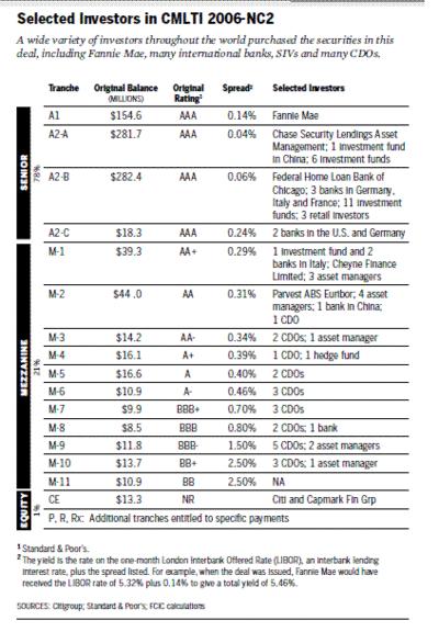 The first private label deals in the late 1980s and early 1990 often had only two tranches, but by 2005–06 the deals became more complex.[26] One "typical" mortgage-backed "deal" from one of the peak years of private label subprime mortgage securities (2006) was described in the Financial Crisis Inquiry Report.[26] (See table to the right.) Dubbed "CMLTI 2006-NC2", the deal involved 4499 subprime mortgages originated by New Century Financial—a California-based lender—and issued by a special purpose entity created and sponsored by Citigroup. The entity issued 19 tranches of mortgage-backed bonds worth $947 million. Since Citigroup and other firms focused on achieving high ratings, the (four) senior ranches rated triple A made up 78% or $737 million of the deal. Eleven tranches were "mezzanine" – three rated AA, three A, three BBB and two BB (junk). The most junior tranche was known as "equity" or "residual" or "first loss". It had no credit rating and was split between Citigroup and a hedge fund.[26] The more "junior" the tranche, the higher its risk and the higher its interest rate in compensation.[27]