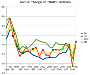 The variability of the change in RPI, due to fluctuations in mortgage interest rates, is shown in the graph on the right. This was one of the arguments used in favour of changing to RPIX.