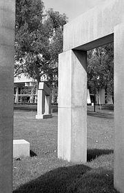 Revelle Plaza is the centerpiece of Revelle College, and has served as an important space for campus activities and socialization since its creation. During the mid-to-late sixties, Revelle Plaza was the location of many protests. The May 1970 Peace Memorial in its southeast corner commemorates the anti-war self-immolation of Revelle student George Winne, Jr.[16] The adjacent fountain was donated by Pacific Southwest Airlines in 1965.[17]