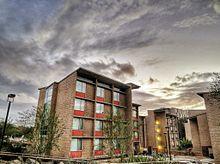 The residential section of the Revelle College campus is located to the west of the plaza. Blake and Argo Halls are between the plaza and the courtyard containing the Anchor. North of this courtyard lies the Revelle Commons complex. In addition to four conference rooms, this complex houses Roger's Market and the Revelle dining commons, 64 Degrees.[18] 64 Degrees serves burgers, Chinese-inspired plates, salads, sandwiches, and American cuisine.[19] In 2015, a full-service restaurant called 64 North was opened to complement 64 Degrees and provide the southern part of campus with an upscale dining option.[20]
