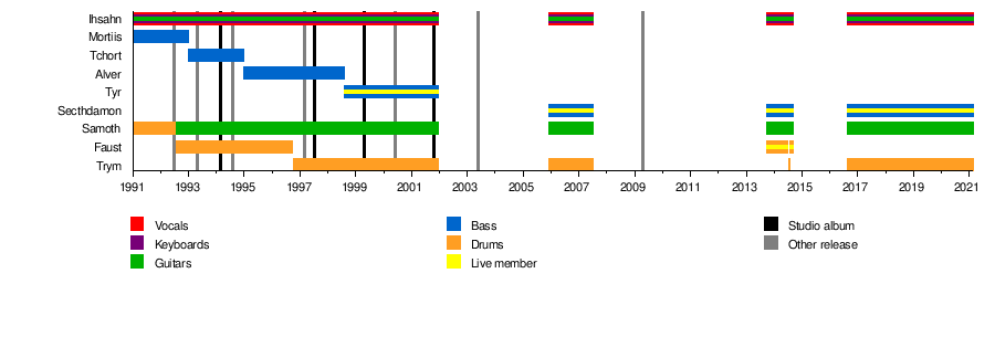 Emperor is a Norwegian black metal band formed in 1991, regarded as highly influential by critics and emerging black metal bands.[2][3][4] The group split up in 2001, but reunited from 2005 to 2007 for a few festival dates and brief US tours, and again reunited in 2013 to 2014. Emperor reformed for the third time in 2016. The group was founded by Ihsahn (guitar/vocal) and Samoth (then, drums).