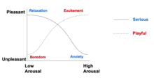 Reversal theory proposes an altogether different view of arousal, which is what is called ‘’bistability’’. Bistability emphasizes polarity in the hedonic tone, and this is represented by the curves of the “butterfly curves” figure. It demonstrates that arousal is experienced in each state in a different - indeed opposite way and has its own unique range of emotions. In the serious (telic) state, represented by the solid curve, this range is from relaxation to anxiety, and in the playful paratelic) state, represented by the dashed curve, from boredom to excitement.[13]