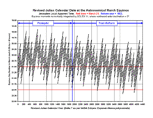 The following is a scatter plot of actual astronomical northward equinox moments as numerically integrated by SOLEX 11[10][11] using DE421 mode[12] with extended (80-bit) floating point precision, high integration order (18th order), and forced solar mass loss[13] ("forced" means taken into account at all times). SOLEX can automatically search for northern hemisphere spring equinox moments by finding when the solar declination crosses the celestial equator northward, and then it outputs that data as the Terrestrial Time day and fraction of day relative to 1 January 2000 at noon (J2000.0 epoch). The progressive tidal slowing of the Earth rotation rate was accounted for by subtracting ΔT as calculated by the Espenak-Meeus polynomial set recommended at the NASA Eclipses web site[14] to obtain the J2000.0-relative Universal Time moments, which were then properly converted to Revised Julian dates and Jerusalem local apparent time, taking local apparent midnight as the beginning of each calendar day. The year range of the chart was limited to dates before the year AD 4400 -by then ΔT is expected to accumulate to about six hours, with an uncertainty of less than 2 1&fras1;2 hours.[15]