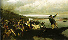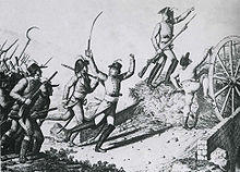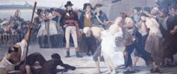 On 24 June 1793, the commanders of the Catholic and royalist army issued an ultimatum to the mayor of Nantes, Baco de la Chapelle to surrender the city or they would massacre the garrison.[28] On 29 June they began an assault with a force of 40,000. Inside the city were Republicans from the surrounding countryside who had fled to Nantes for safety, fortifying the defenders with tales of the horrors that the rebels inflicted on towns they managed to take. Baco de la Chapelle stood on a dustcart that he called the 'chariot of victory' to urge the people on, even after he had been wounded in the leg. Poor coordination between the four Vendean armies led by Charette, Bonchamps, Cathelineau and Lyrot hampered the assault, and Cathelineau's forces were delayed in their deployment by fighting along the Erdre river with a Republican battalion. Cathelineau himself was shot at the head of his forces, causing his men to lose heart and retreat; ultimately, the Vendeans were unable to take the city.[29] In October 1793, in order to punish the Vendean prisoners taken after the failure of the siege of Nantes, Jean-Baptiste Carrier ordered them to be shot en masse. When this proved impractical, he had the prisoners rounded up and put out on the Loire river in boats equipped with trap-door bottoms; when these opened the victims were left to drown.[30] On this occasion it was rumored that female prisoners were stripped and tied up with men before being sent to their deaths, the so-called Republican Marriage.[31] Some later historians dispute this story as a counter-revolutionary myth.[32]