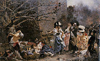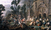Class differences were not as great in the Vendée as in Paris or in other French provinces. In the rural Vendée, the local nobility seems to have been more permanently in residence and less bitterly resented than in other parts of France.[6] Alexis de Tocqueville noted that most French nobles lived in cities by 1789. An Intendants' survey showed one of the few areas where they still lived with the peasants was the Vendée.[7] The conflicts that drove the revolution in Paris, for example, were also lessened in this particularly isolated part of France by the strong adherence of the population to their Catholic faith. When the revolutionaries wanted to reduce the Church's influence, people of the Vendée region considered this unimaginable.[8] In 1791, two representatives on mission informed the National Assembly of the disquieting condition of Vendée, and this news was quickly followed by the exposure of a royalist plot organized by the Marquis de la Rouërie.[9] It was not until the social unrest and the fear of The Terror (a period between 1793 and 1794 where tens of thousands of people were beheaded by use of guillotine) combined with the external pressures from the Civil Constitution of the Clergy (1790) and the introduction of a levy of 300,000 on the whole of France, decreed by the National Convention in February 1793, that the region erupted.[10][11]