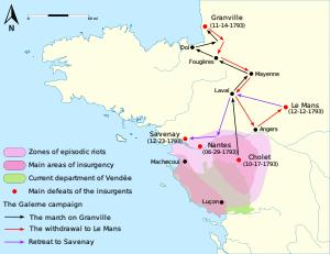 The Republican army was reinforced, benefiting from the first men of the levée en masse and reinforcements from Mainz. The Vendean army had its first serious defeat at the Battle of Cholet on 17 October; worse for the rebels, their army was split. In October 1793 the main force, commanded by Henri de la Rochejaquelein and numbering some 25,000 (followed by thousands of civilians of all ages), crossed the Loire, headed for the port of Granville where they expected to be greeted by a British fleet and an army of exiled French nobles. Arriving at Granville, they found the city surrounded by Republican forces, with no British ships in sight. Their attempts to take the city were unsuccessful. During the retreat, the extended columns fell prey to Republican forces; suffering from hunger and disease, they died in the thousands. The force was defeated in the last, decisive Battle of Savenay on 23 December.[39][40] Among those executed the following day was lieutenant-general Jacques Alexis de Verteuil, but some historians assert that after the battle of Savenay the rebellion was still going on.[41]