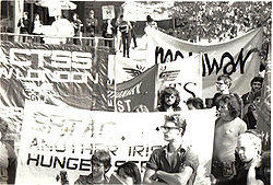 Supporting Irish republicanism was central to the work of the party. In 1978, it organised the Smash the Prevention of Terrorism Act Campaign and held protests outside police stations where suspects were held. The party organised a conference of trade unionists opposed to Northern Ireland being part of the United Kingdom in Coventry in 1981 and later that year held a march to the TUC conference, the Workers March for Irish Freedom. On Saturday 6 February 1982, the Irish Freedom Movement (IFM) was founded at a meeting in Caxton House, Archway and TUC general secretary Len Murray wrote to the thirteen trades councils that sponsored the conference threatening them with disaffiliation if they attended.[17] Mick Hume, who edited The Next Step, recalls that the IFM were accused of complicity in the 1984 bombing of the Conservative Party conference.[18] The IFM published a quarterly bulletin Irish Freedom and organised an annual march on the anniversary of internment. When the voices of Sinn Féin supporters were banned from the British broadcast media, Living Marxism carried a front page interview with its leader Gerry Adams and the IFM picketed Broadcasting House.