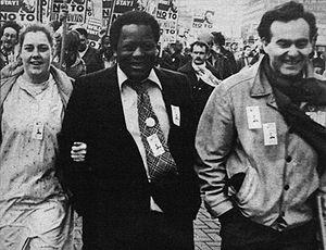 The party's Workers Against Racism campaign fought many deportation threats, like George Roucou's, on the grounds that British immigration law was racist. Roucou was a shop steward in the building workers' union UCATT in Manchester. Workers Against Racism helped to organise a campaign culminating in a one-day strike and demonstration by his fellow council workers on 6 February 1987. On 13 March 1987, with 500 protesting outside, the Home Office appeal panel reversed Roucou's deportation order.[15] On 11 June 1985, Metso Moncrieffe was arrested and held by police pending a deportation order. Workers Against Racism campaigners raised the case, disrupting a test match at the Edgbaston cricket ground in July 1985 with a Metso Must Stay banner and helping to build a 1,000-strong march for him in December 1986. In September 1987, Moncrieffe's deportation order was overturned.[16]