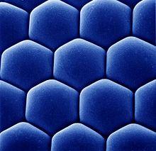 Although composed of over 16,000 cells,[6] the Drosophila compound eye is a simple repetitive pattern of 700 to 750 of ommatidia,[7] initiated in the larval eye imaginal disc. Each ommatidium consists of 14 neighboring cells: 8 photoreceptor neurons in the core, 4 non-neuronal cone cells and 2 primary pigment cells.[6] A hexagonal lattice of pigment cells insulates the ommatidial core from neighboring ommatidia to optimize coverage of the visual field, which therefore affects the acuity of Drosophila vision.[7]