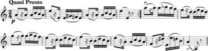 The 24th variation is more playful in tone than most of the other variations, ending with a glissando sweep of the keyboard, before quoting the original theme in the last bar.[7] Due to the speed and the large leaps on the piano, the 24th and last variation of the rhapsody presents considerable technical difficulty for the pianist. Shortly before the world première performance, Rachmaninoff – a sufferer of performance anxiety[8] – confessed trepidation over his ability to play it. Upon the suggestion of his friend Benno Moiseiwitsch, Rachmaninoff broke his usual rule against drinking alcohol and had a glass of crème de menthe to steady his nerves, which he reputedly kept beneath the piano.[9] His performance was a spectacular success, and prior to every subsequent performance of the Rhapsody, he drank crème de menthe. This led to Rachmaninoff nicknaming the twenty-fourth the "Crème de Menthe Variation".[10]
