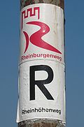 The Rheinhöhenweg Trail is a popular hiking trail on the mountains of the Rhine Valley. It leads from the Lower Rhine in Bonn passing the Loreley up to the Upper Rhine. There is a Rheinhöhenweg Trail on both sides of the Rhine River. On the left side it goes from Bonn to Alsheim, which is to the south of Mainz, with a total length of 240 km. On the right side it goes from Bonn-Beuel to Wiesbaden with a total length of 272 km. Both trails together have a combined length of over 500 km. The Rheinhöhenweg Trail is marked by a black R on a white background. The trails on the left and on the right side are frequently connected by hiking trails called "Rheinhöhen Connection Trails", marked by the sign "RV".